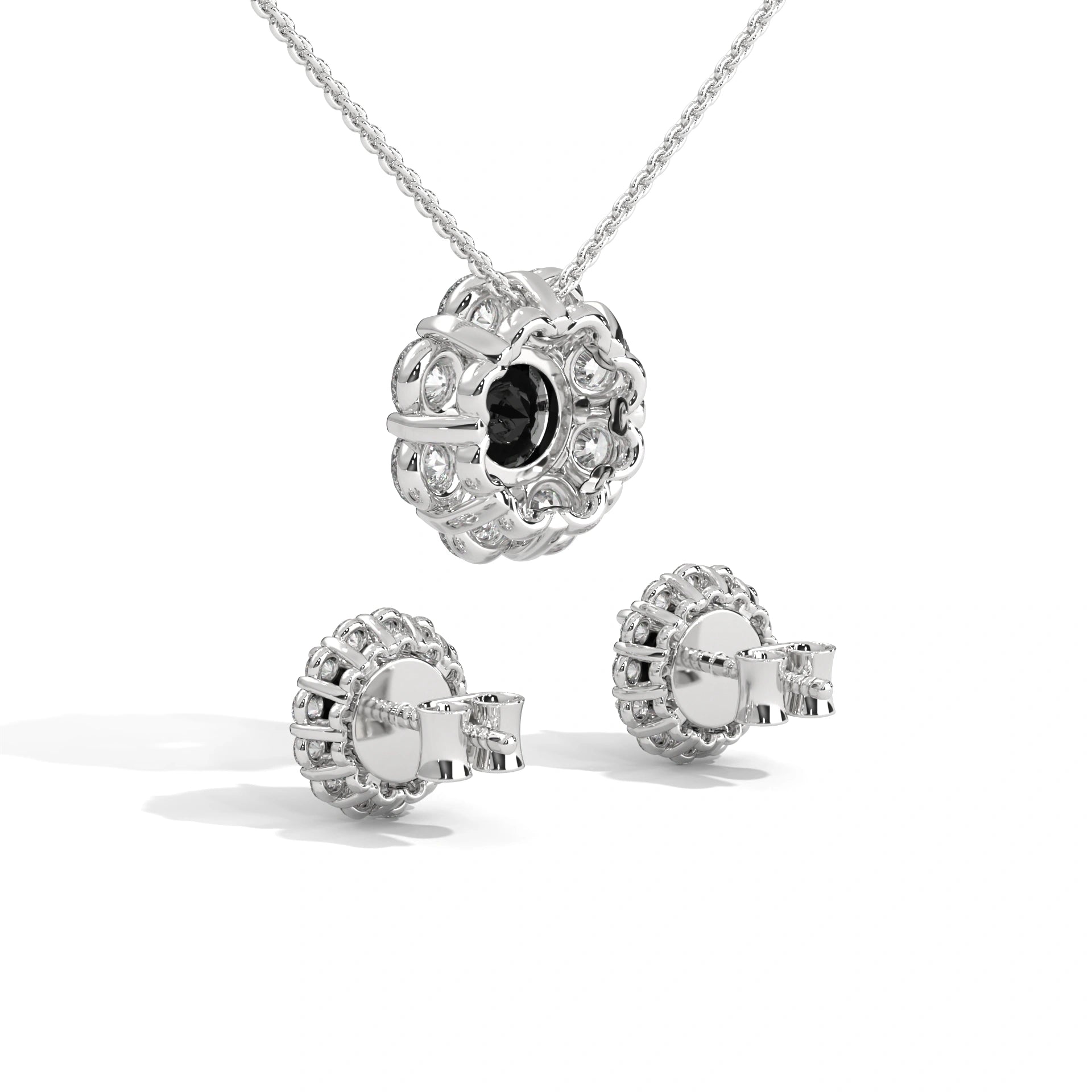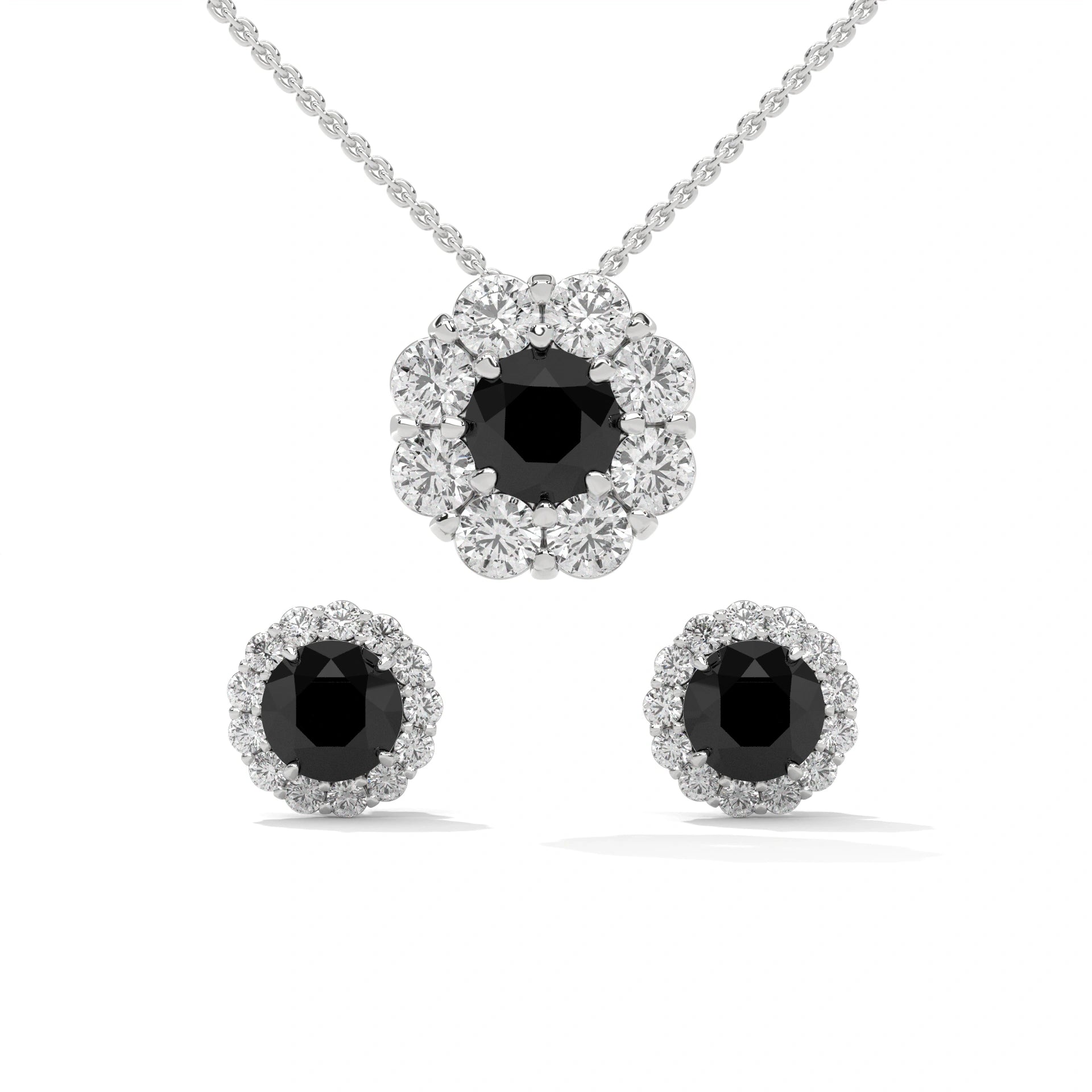 Elegant Round Black Diamond Halo Pendant & Earrings Set