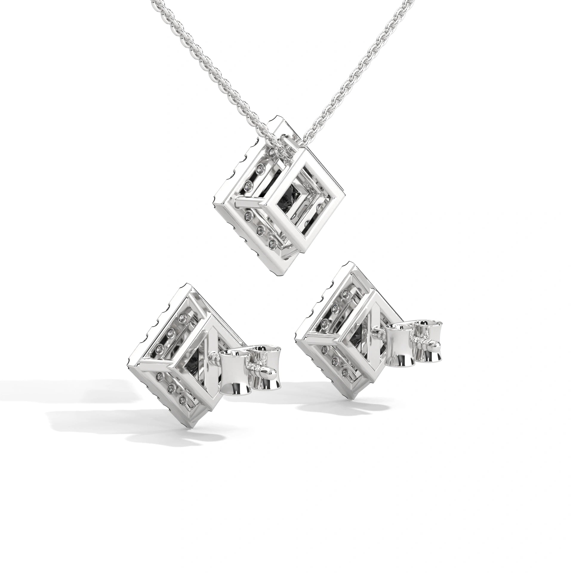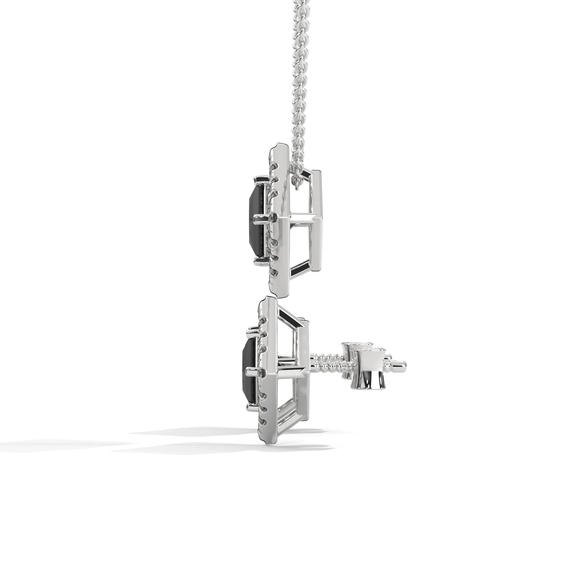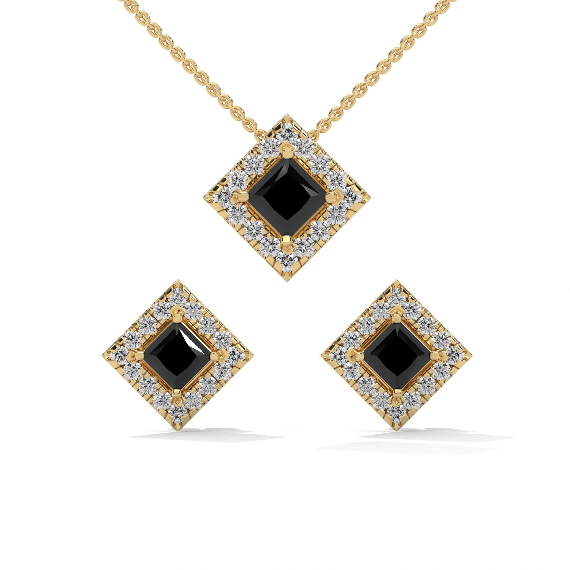 This stunning 1.06 Ct princess cut black diamond pendant and matching diamond stud earrings are perfect for everyday or special occasions. Set in yellow gold, the black diamond pendant is accented with a white diamond halo surround, while the matching Black Diamond Men’s earrings have a similar design. The bright display of the combination of the deep black diamond set against the background of bright white diamonds will enhance any moment by providing a warm, elegant touch. As an ideal gift for a birthday, anniversary, or special occasion, this diamond jewelry set makes a wonderful addition to anyone's Fine jewelry wardrobe.