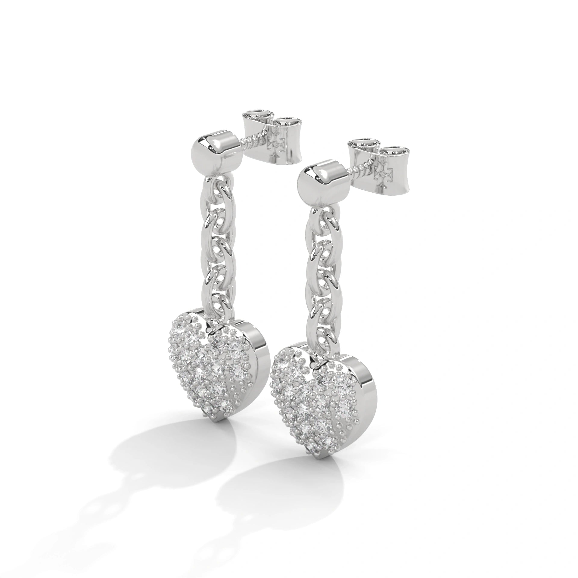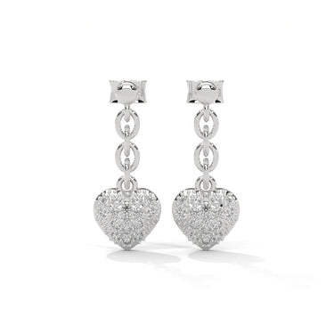 Expertly Crafted For Comfort And Durability, Each Drop Earring Features Round Brilliant Loose Lab Grown Diamonds In Heart Shaped Pave Setting For Maximum Sparkle, Designed To Maximize Protection And Romantic Movement. The Bright White Gold Creates A Clean Base, While The Secure Post Backs Ensure Worry-Free Daily Wear. Customizations Let You Choose Drop Length Variations To Suit Any Personal Style.