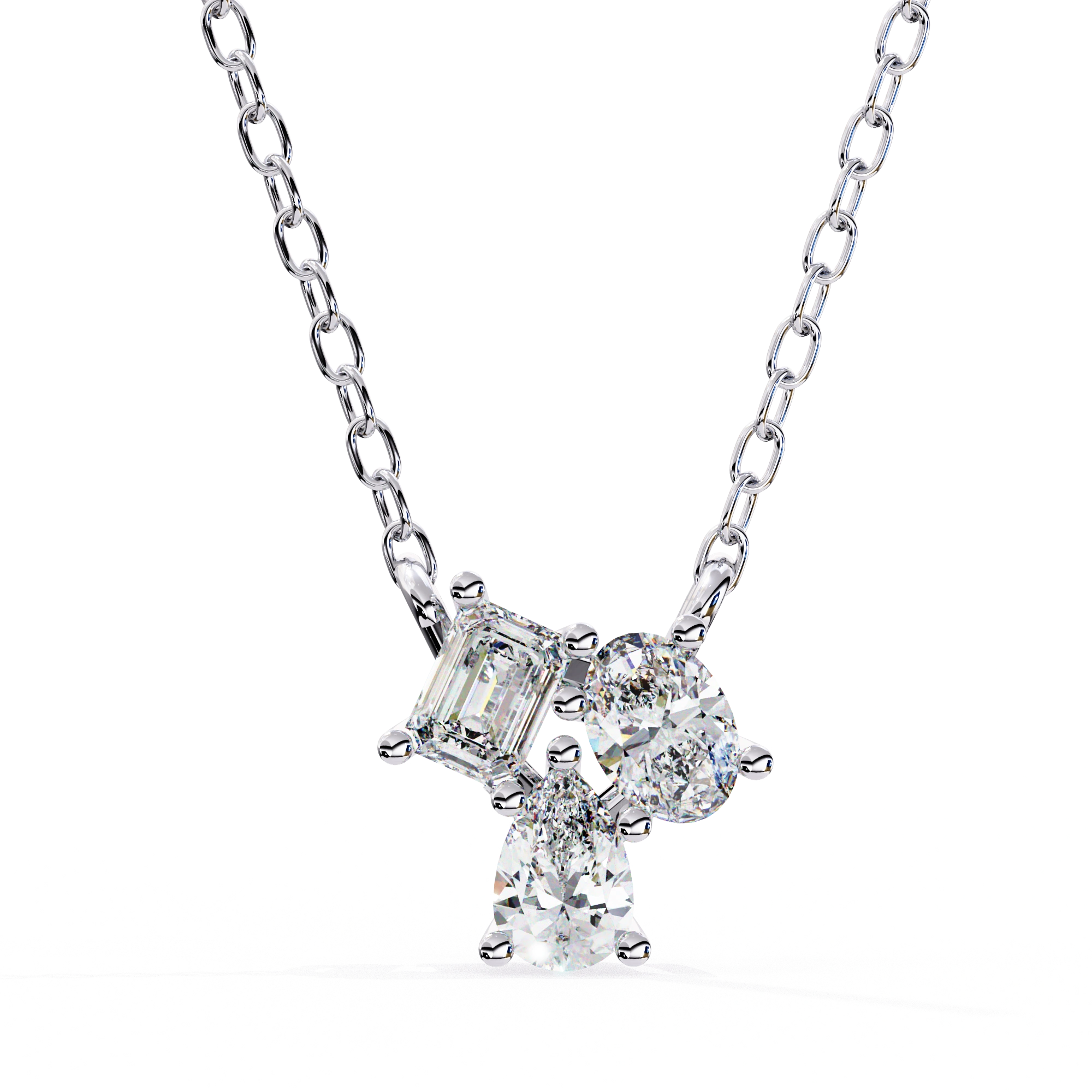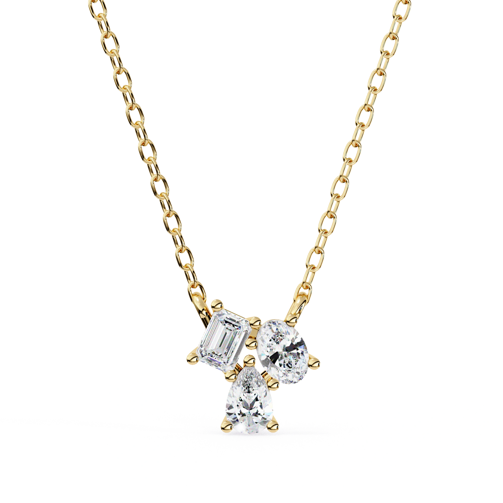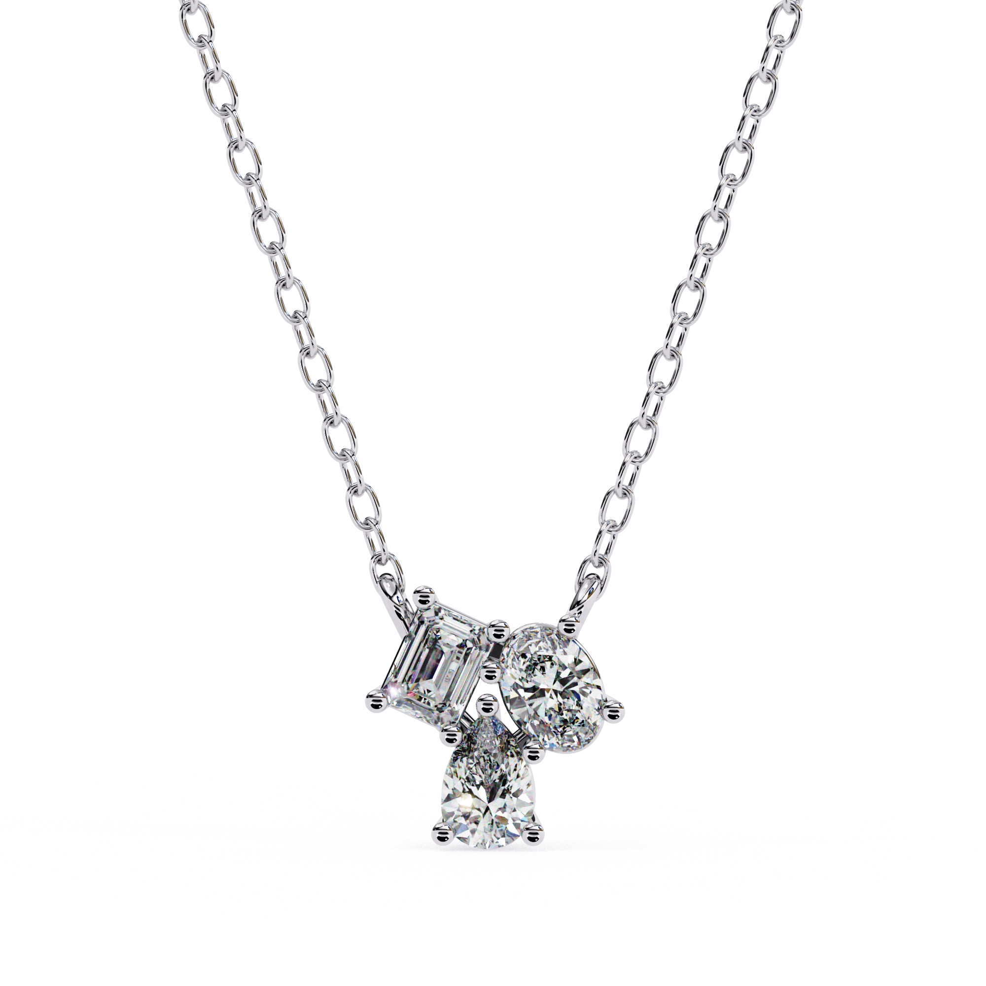 This 0.50ct Lab Diamond Cluster Necklace Features A Mix Of Shapes Arranged In An Off-Balance Layout For A Creative Look. The Lab Diamond Cluster Necklace Includes Emerald, Oval, And Pear Cuts Placed Together To Form A Design That Feels Different From Traditional Styles.
