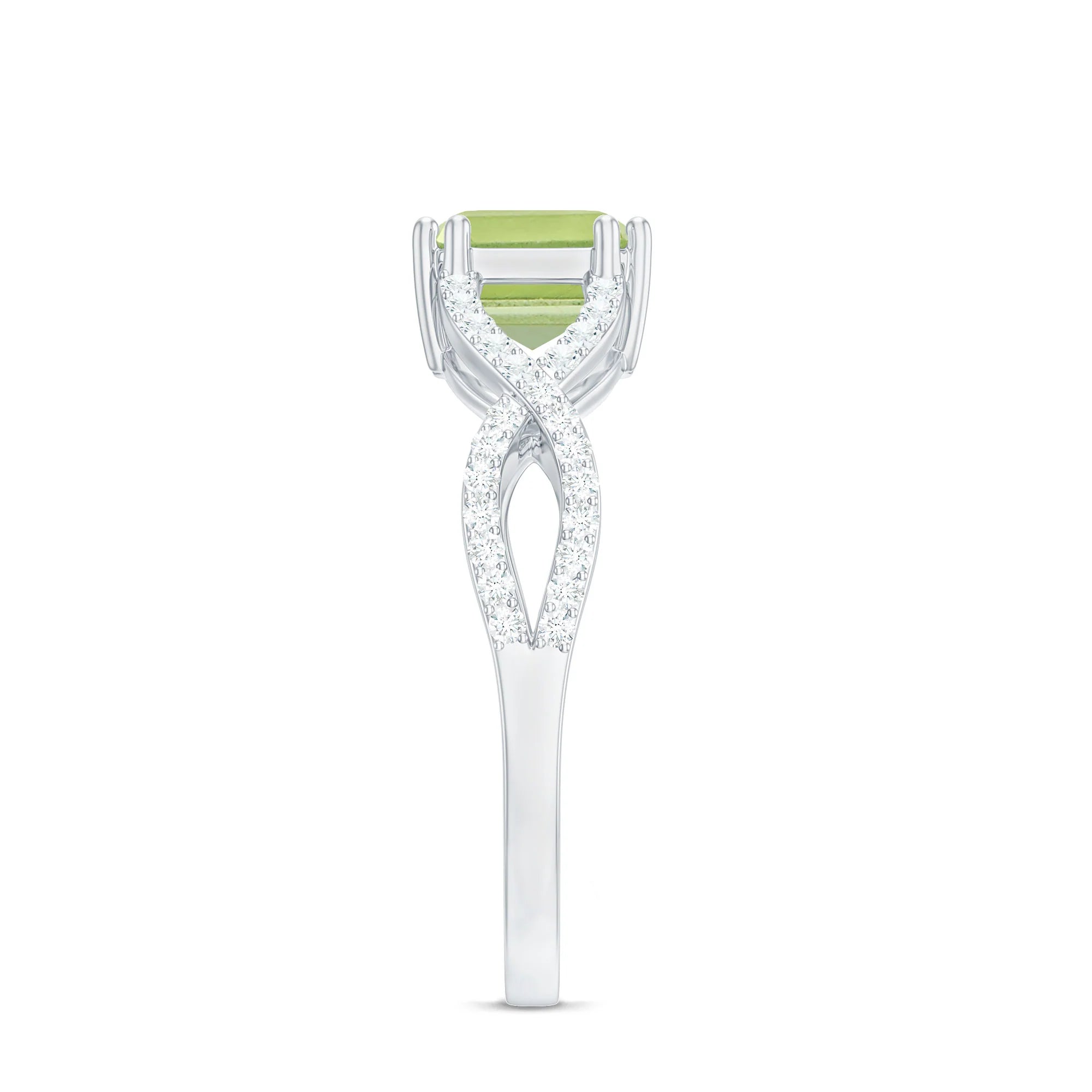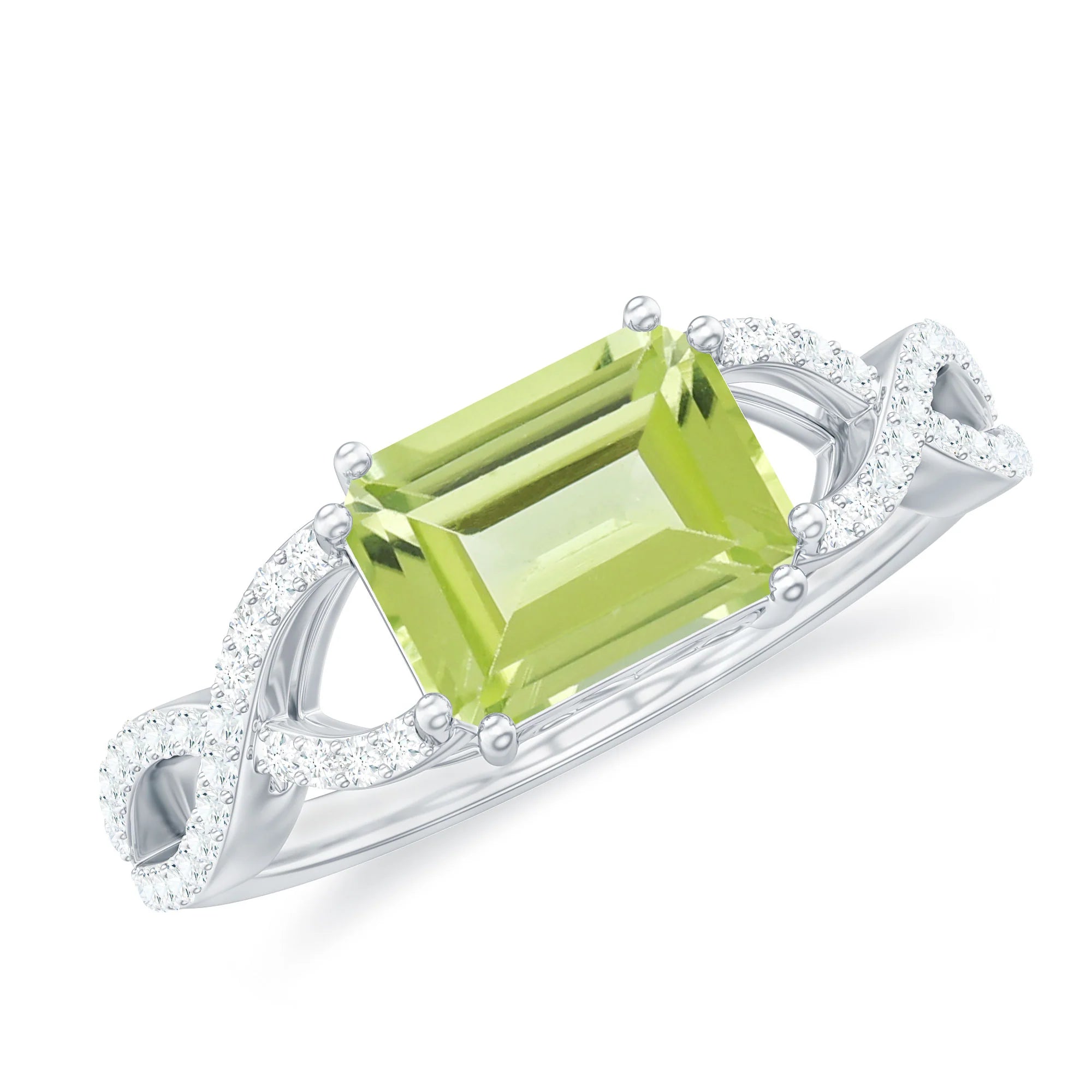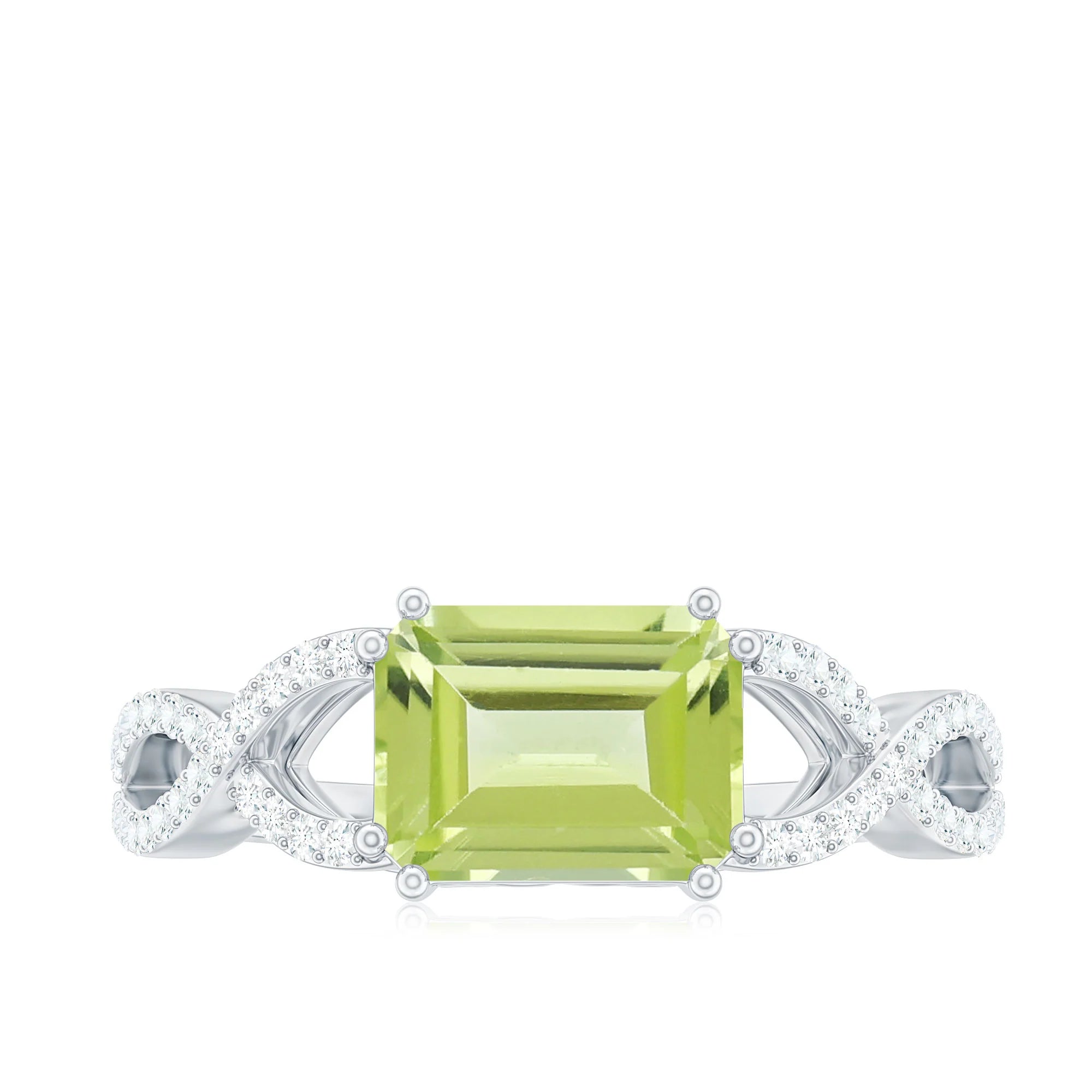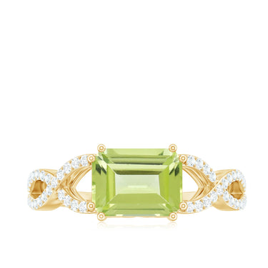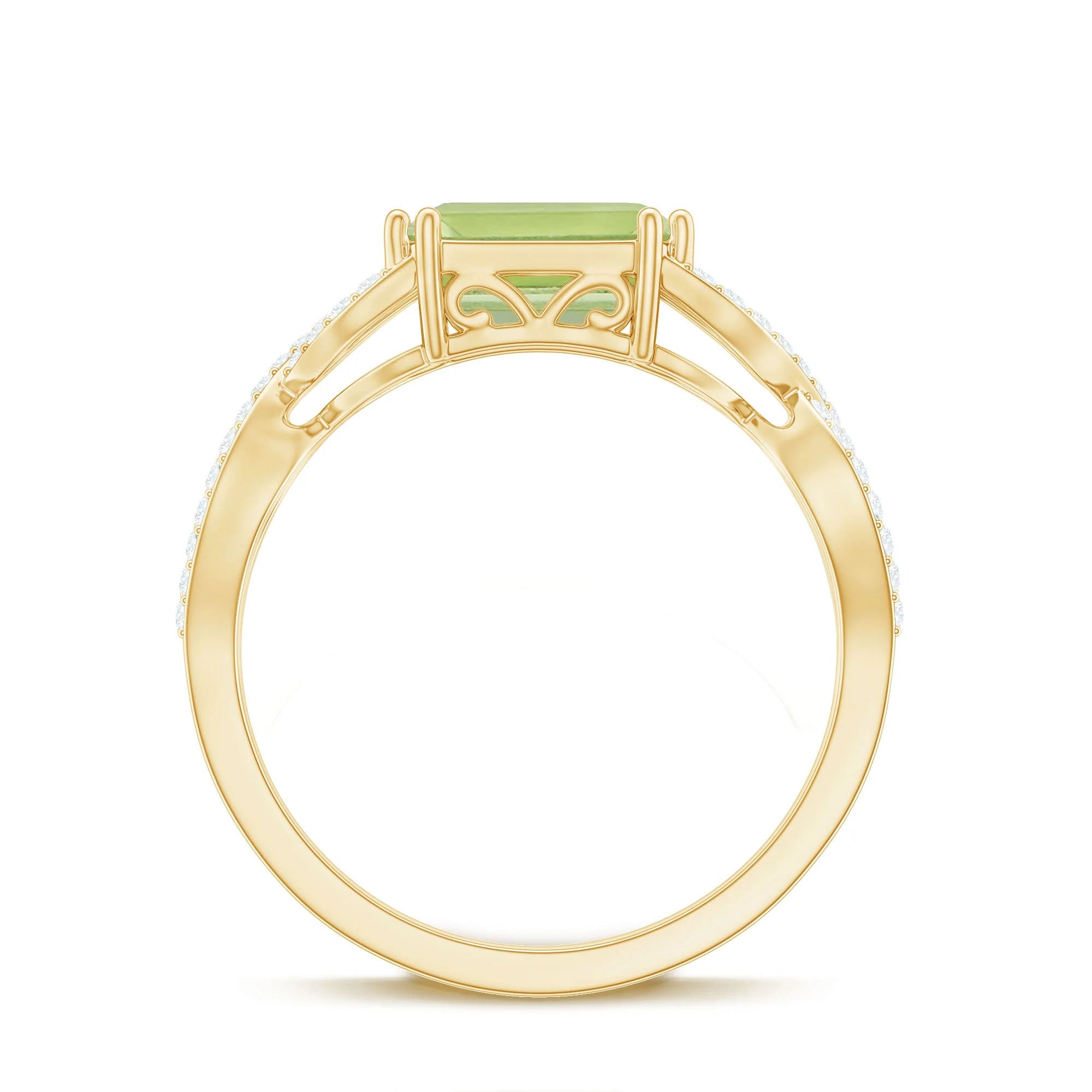 Shop This Trending 2.20 Carat Emerald Cut Prong Setting Peridot Gemstone Twisted Ring, Which Sits Beautifully In A Twisted Band, Adding Movement And Charm. The Prong Setting Highlights The Peridot Gem’s Light Green Sparkle, With The Perfect Emerald Cut Shape And Size Of 2.20 Carats This Twisted Engagement Ring Is A Perfect For A Fresh Style.