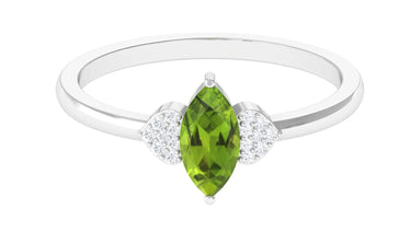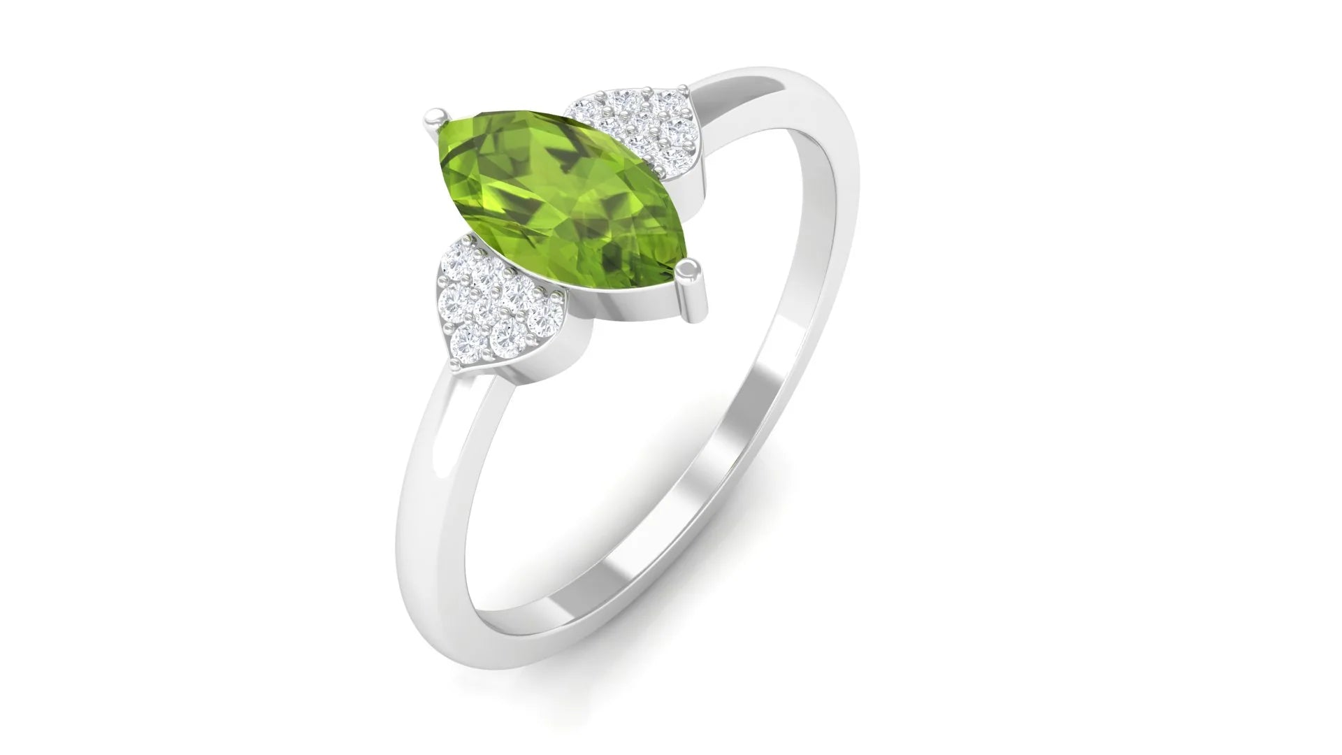 We Are Here With A Luxurious And Affordable Eye-Catching Engagement Ring, Which Features A 2.30 Ct Marquise Peridot Gemstone, Enhanced By Two Side Stones. The Elongated Shape And Three-Stone Design Add An Elegance With A Meaningful Symbolism. This 2.30 Ct Marquise 3 Stone Peridot Gemstone Engagement Ring Is A Perfect Fit For Marking Love’s Journey.